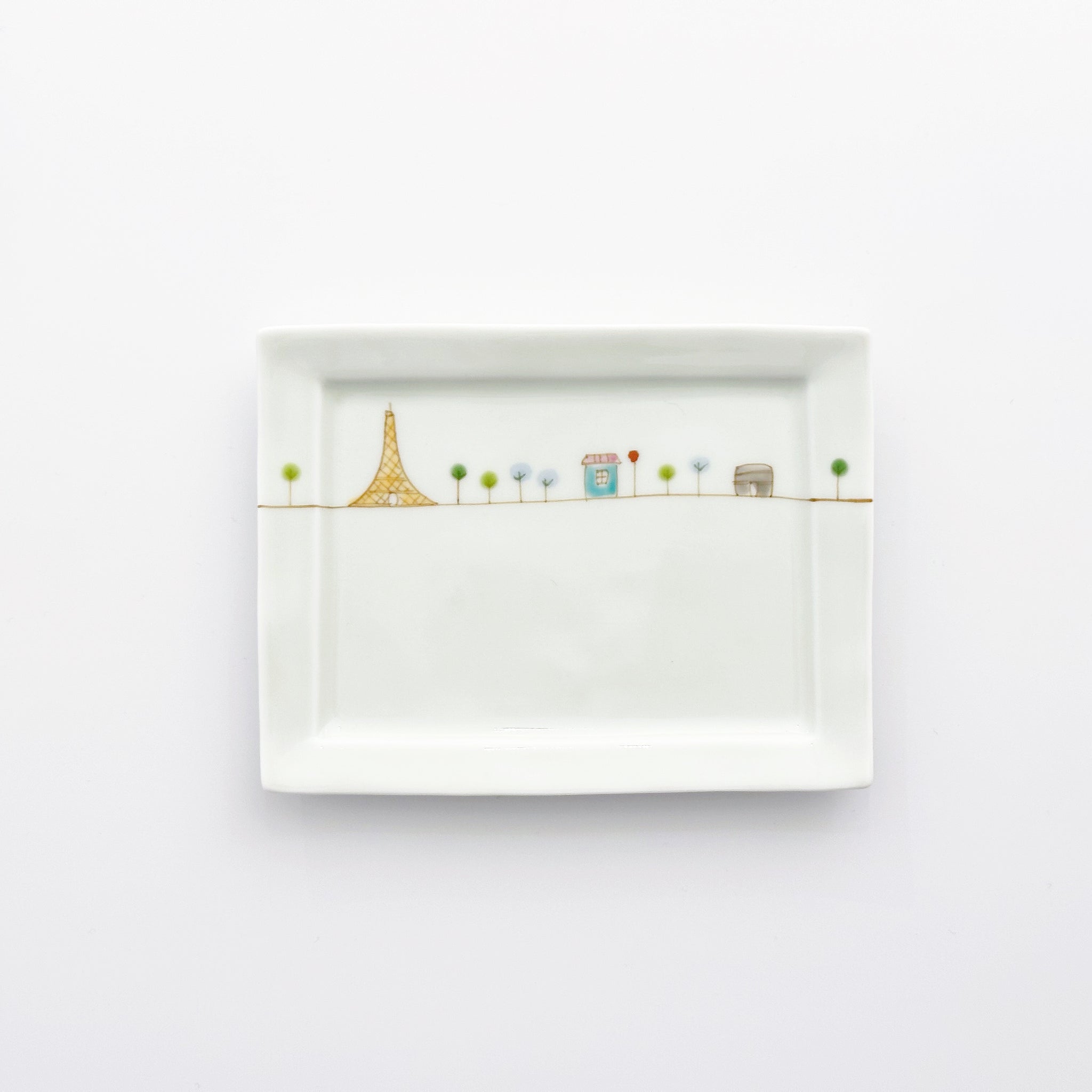 さんぽシリーズの小さな長角トレイ。可愛らしいデザインで、スナックや前菜、小さな盛り付けにぴったりです。